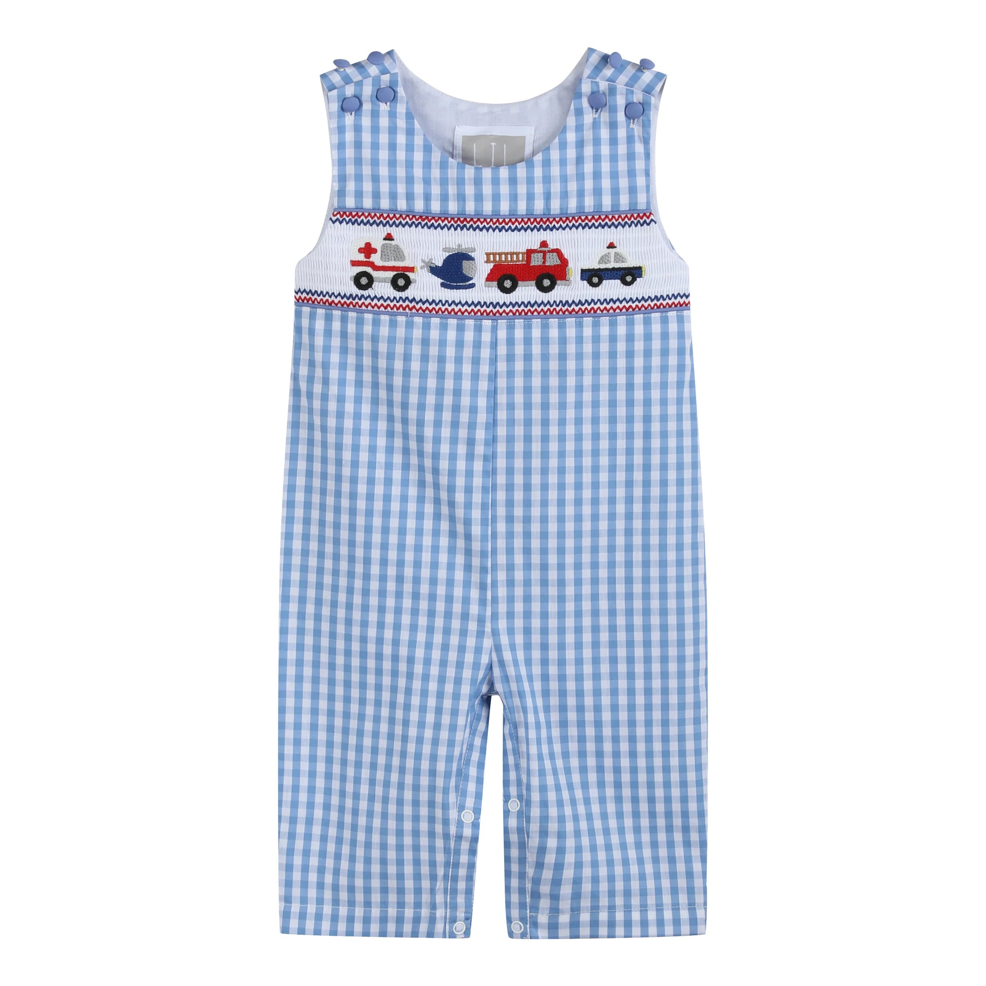 Dress your little hero in picture-perfect style in these adorable Blue Gingham Emergency Vehicle Smocked Overalls! Adorably smocked on the chest and embellished with charming embroidered emergency vehicles, these overalls are as cute as they are ready for action. Ideal for your tiny first responder, this outfit captures the essence of playtime adventures in the sweetest way possible!