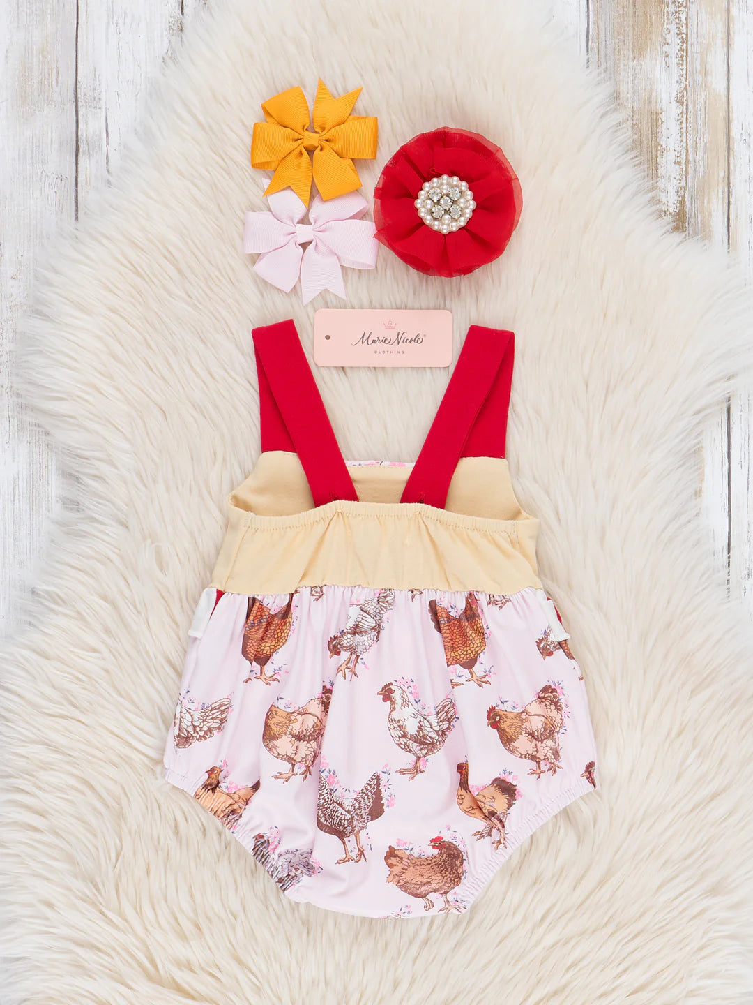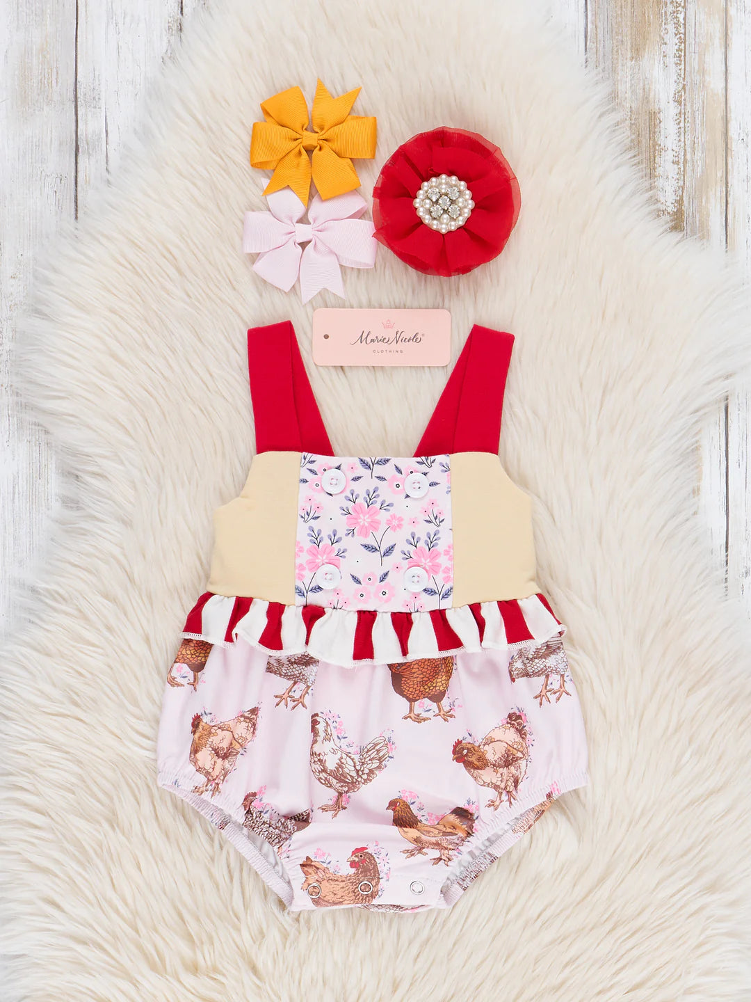 Get ready to rule the roost with this adorable Home to Roost Ruffle Bubble! This girls' bubble includes a soft yellow bodice with a bold chicken print, paired with bright red striped ruffle detail. Don't chicken out on this stylish and playful outfit!