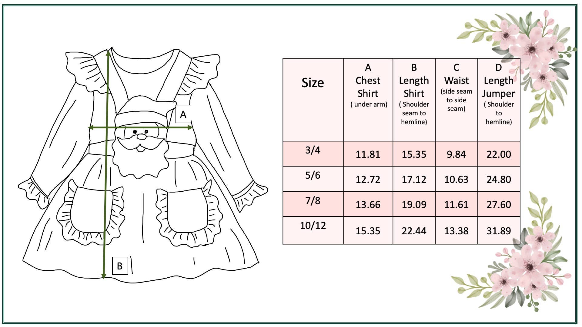 Girls two piece set includes red & white striped long sleeve ruffle shirt with Red ruffle pinafore jumper skirt. Ruffle pockets and large applique Santa on front make this the cutest Christmas Holiday set!