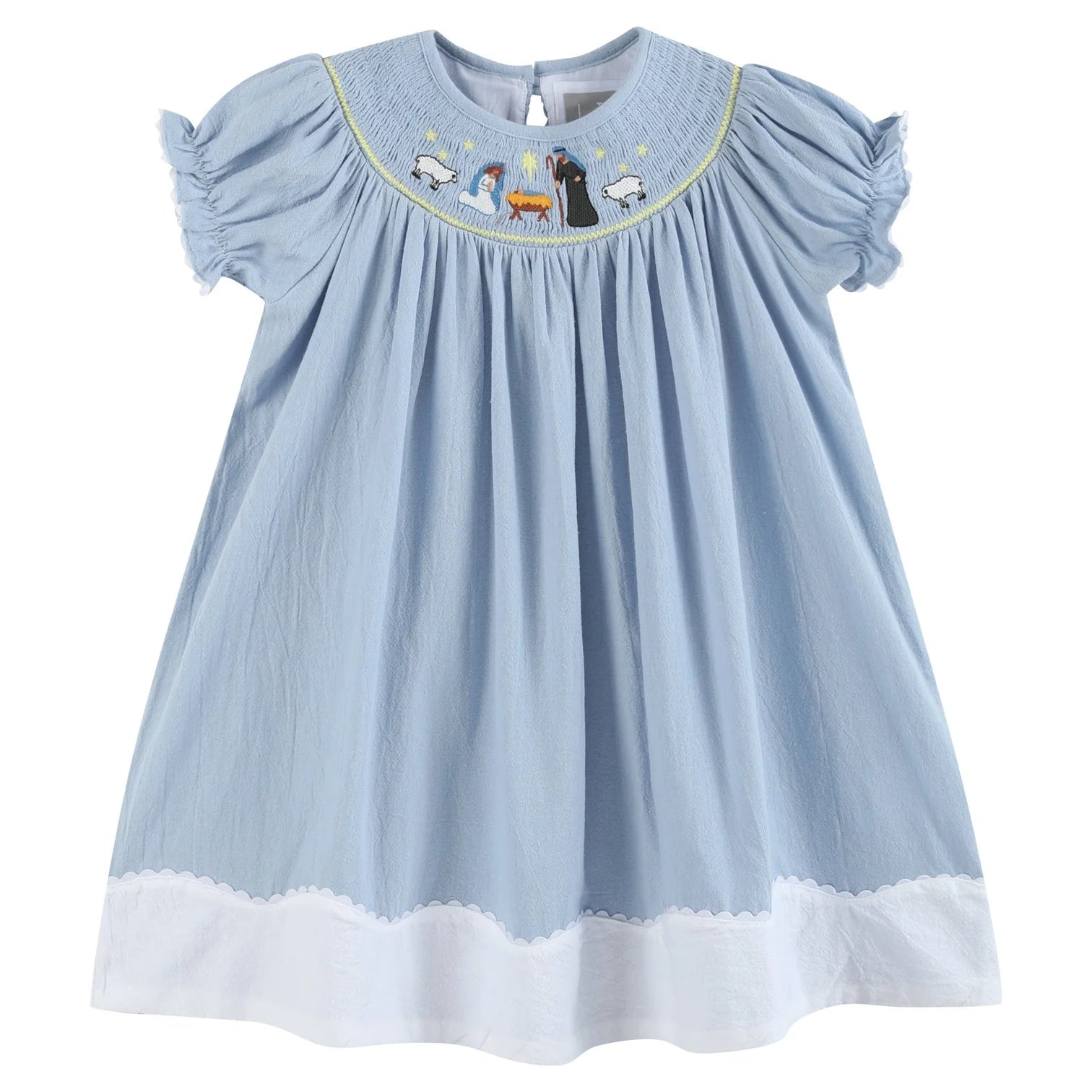 Light Blue Nativity Smocked Bishop Sleeve Dress