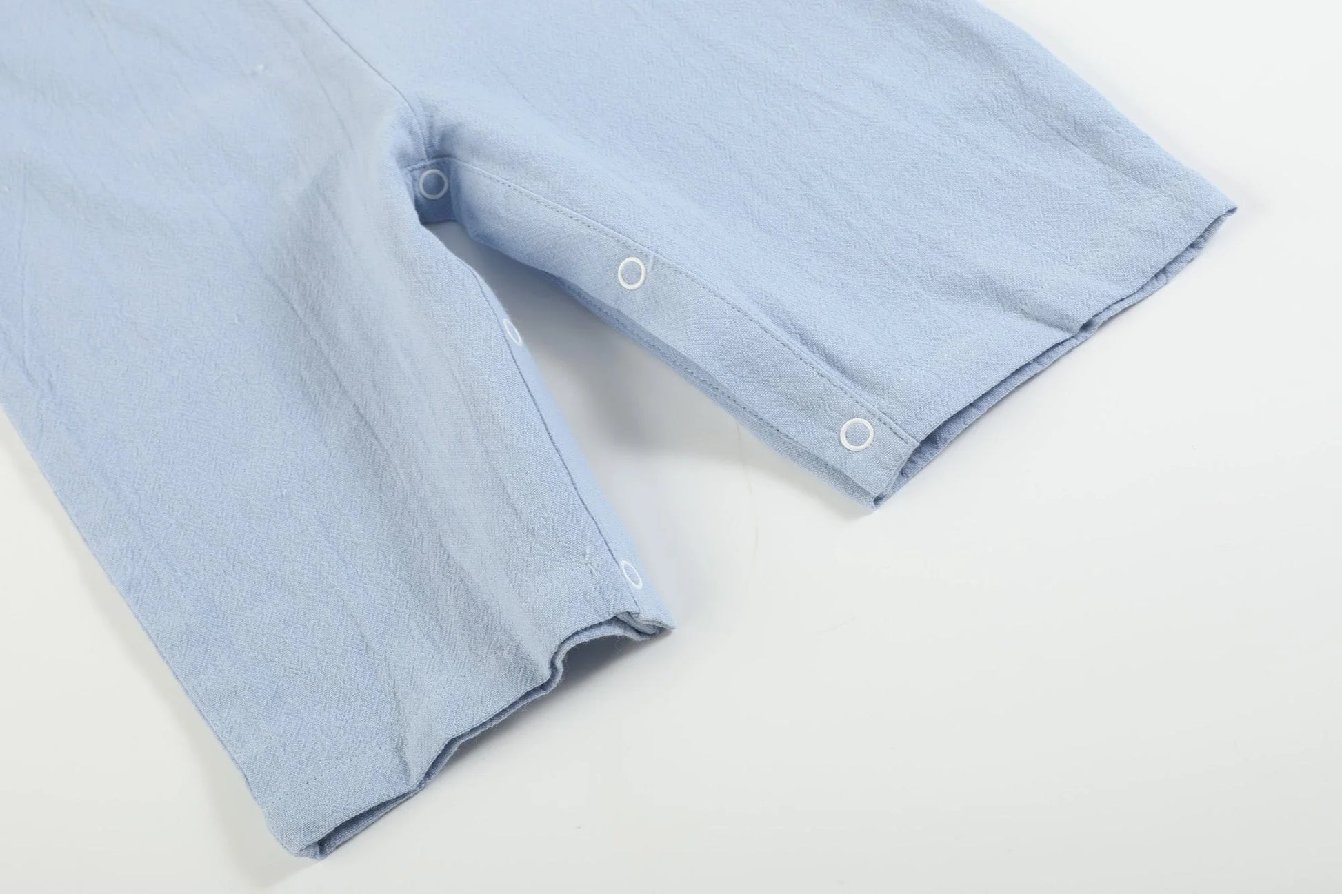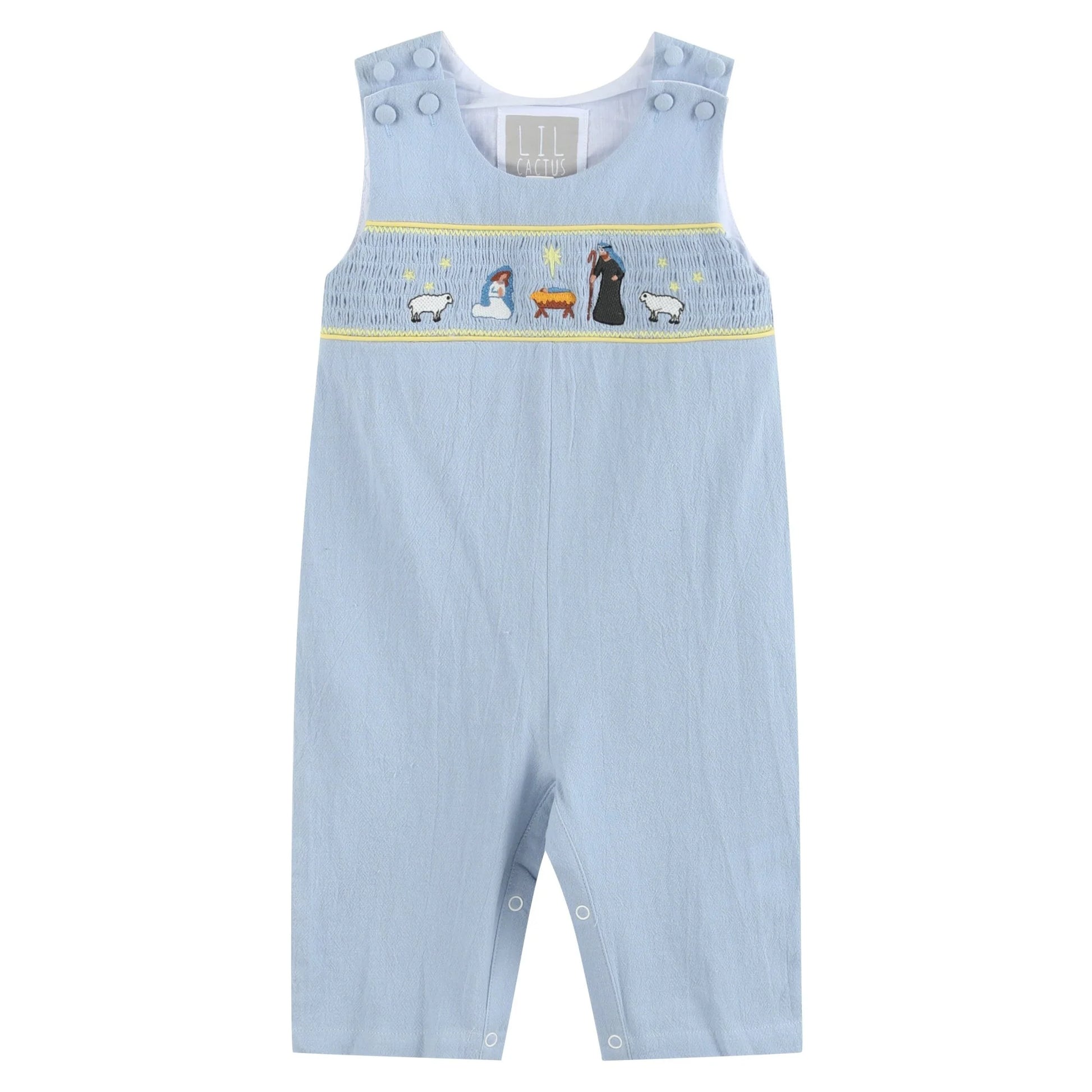 Elevate your little one's Christmas style with charming overalls featuring sweet smocking on the chest and a beautifully embroidered nativity scene. Embrace the festive spirit with this delightful ensemble, perfect for creating cherished holiday memories. Snaps at the crouch make sure diaper changes will be a breeze and made in 100% soft cotton to ensure he is comfortable all day long.